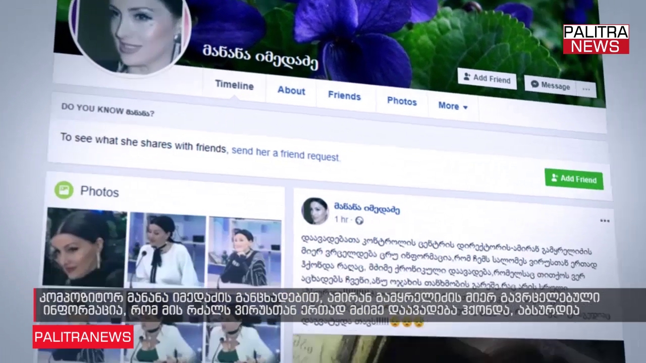 კომპოზიტორ მანანა იმედაძის განცხადებით, დაავადებათა კონტროლის ცენტრის დირექტორის მიერ გავრცელებული ინფორმაცია, რომ მის რძალს ვირუსთან ერთად მძიმე დაავადება ჰქონდა, აბსურდია. ამის შესახებ ის სოციალურ ქსელში წერს. "ამირან გამყრელიძის მიერ ვრცელდება ცრუ ინფორმაცია,რომ ჩემს სალომეს ვირუსთან ერთად ჰქონდა რაღაც, მძიმე ქრონიკული დაავადება,რომელსაც თითქოს ვერ აცხადებს ჩვენი, ანუ ოჯახის თანხმობის გარეშე, რაც არის სრული აბსურდი! ძალიან გთხოვთ, რომ თავი შეიკავოთ ასეთი ცრუ განცხადებებისგან, რადგან ოჯახს ისედაც გვეყოფა რა საშინელი ტრაგედიაც დაგვატყდა თავს" - წერს სოციალურ ქსელში კომპოზიტორ მანანა იმედაძე
