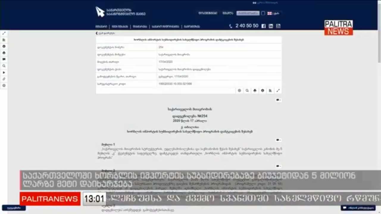 ამასთან, პროგრამის პირობების თანახმად, სუბსიდიის მოცულობა შეადგენს ერთ ტონა ხორბალზე არაუმეტეს 40 დოლარის ეკვივალენტს ლარში. სუბსიდირება განხორციელდება 2020 წლის 20 მაისის ჩათვლით იმპორტირებულ ხორბალზე.