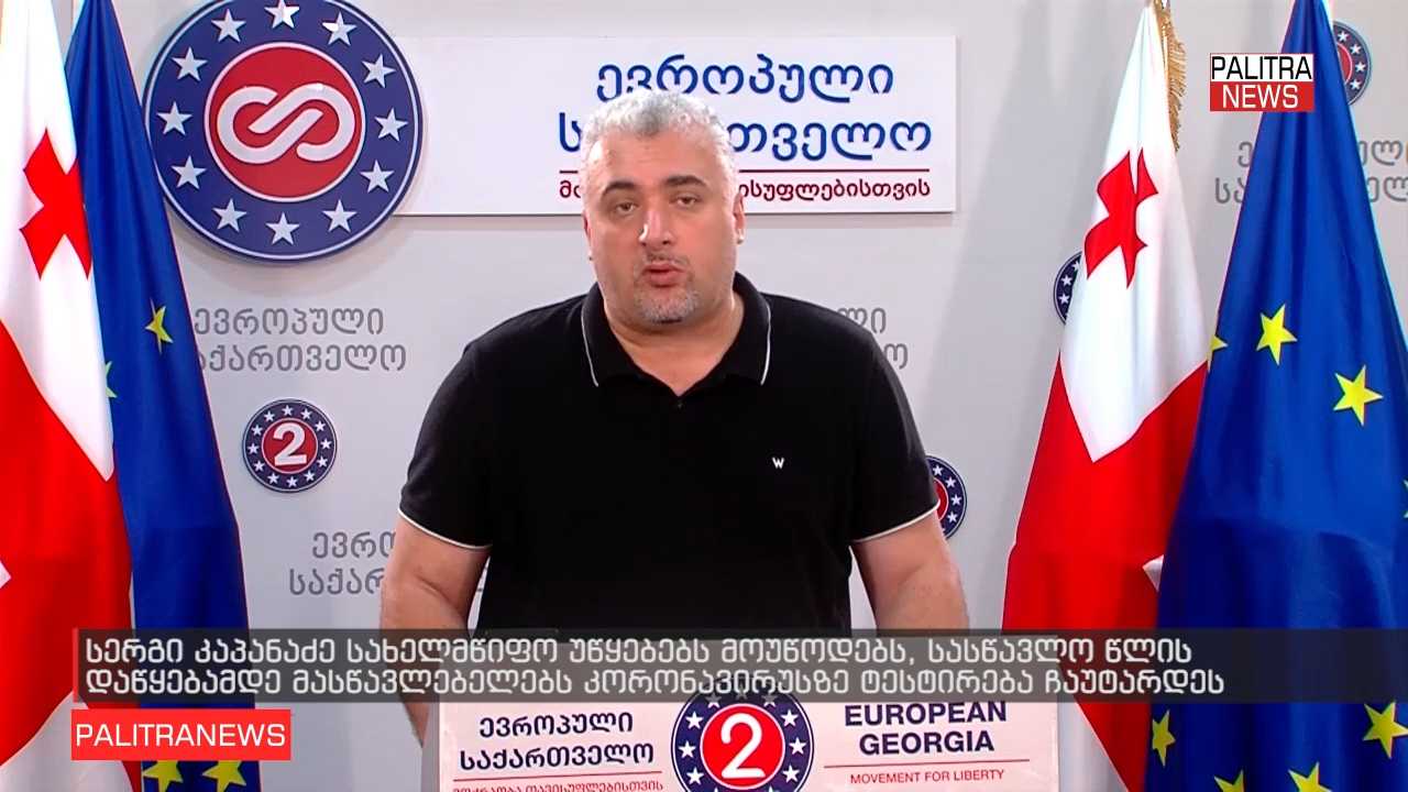 „ევროპული საქართველოს“ საარჩევნო შტაბის ხელმძღვანელი, სერგი კაპანაძე, სახელმწიფო უწყებებს მოუწოდებს, რომ სასწავლო წლის დაწყებამდე მასწავლებელებს კორონავირუსზე ტესტირება ჩაუტარდეთ.