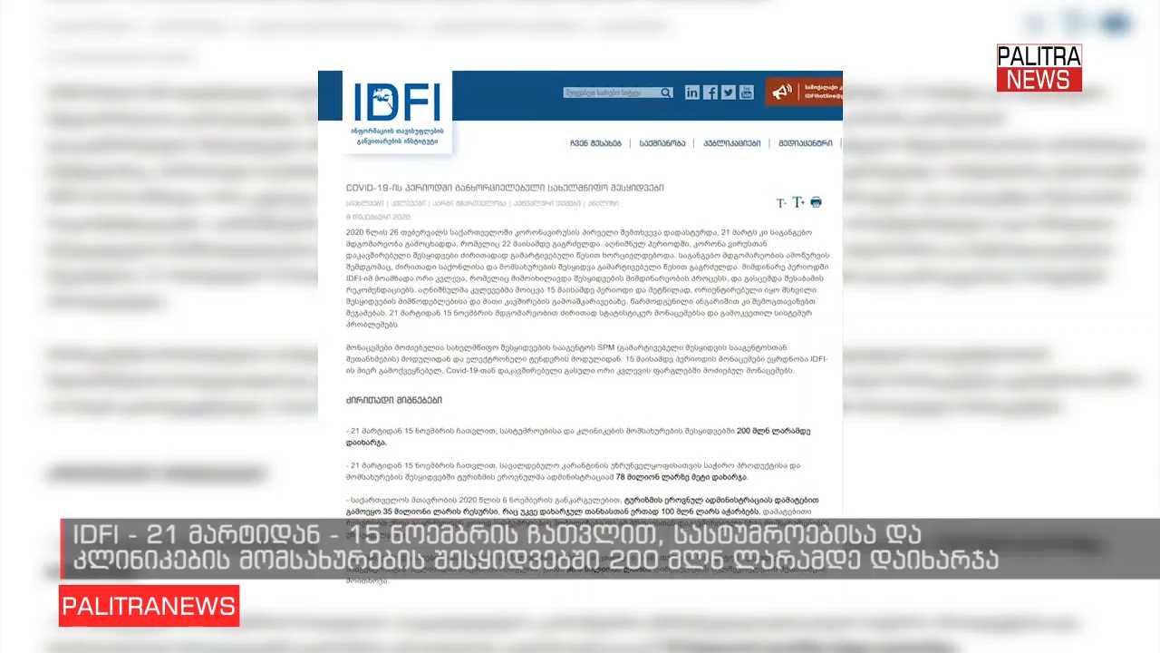 ინფორმაციის თავისუფლების განვითარების ინსტიტუტის (IDFI) მიერ მომზადებული ანალიზის მიხედვით, COVID-19-ის პერიოდში, 21 მარტიდან -15 ნოემბრის ჩათვლით, სასტუმროებისა და კლინიკების მომსახურების შესყიდვებში 200 მლნ ლარამდე დაიხარჯა.