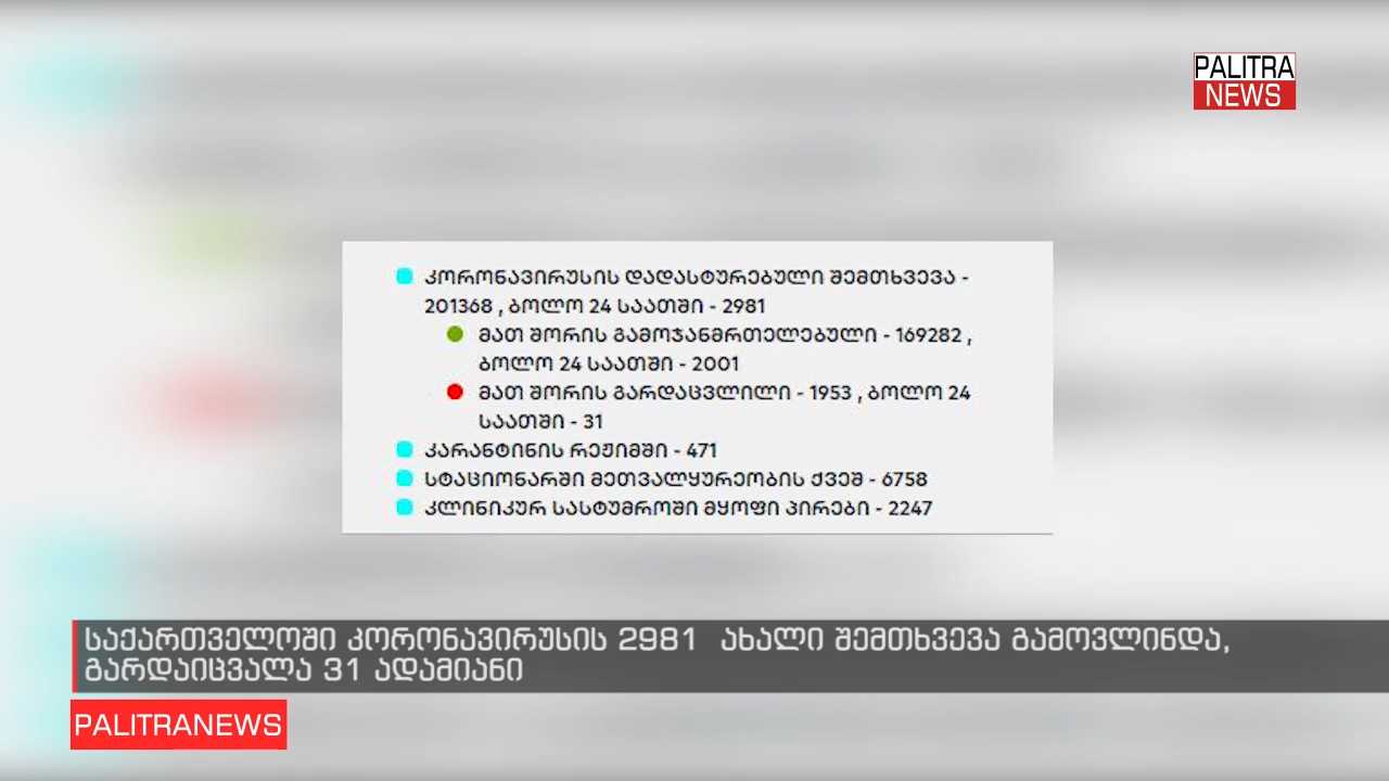 ბოლო 24 საათის განმავლობაში, საქართველოში კორონავირუსის 2 981 ახალი დადასტურებული შემთხვევა გამოვლინდა და ჯამში დადასტურებული შემთხვევების საერთო რაოდენობამ 201 368 შეადგინა. გამოჯანმრთელდა 2 001 ადამიანი, შესაბამისად, გამოჯანმრთელებულთა რაოდენობა 169 282-მდე გაიზარდა.ბოლო 24 საათში, კორონავირუსით 31 ადამიანი გარდაიცვალა და ჯამში კორონავირუსით გარდაცვლილთა რაოდენობა 1 953 გახდა.