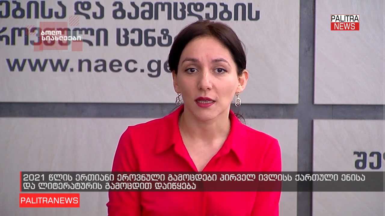 2021 წლის ერთიანი ეროვნული გამოცდები პირველ ივლისს ქართული ენისა და ლიტერატურის გამოცდით დაიწყება. 14 ივლისიდან გამოცდებში მასწავლებლები და მასწავლებლობის მსურველი პირები ჩაერთვებიან. 28 ივლისს სტუდენტთა საგრანტო კონკურსი ჩატარდება, ხოლო საერთო სამაგისტრო გამოცდას მაგისტრანტობის კანდიდატები 27-30 ივლისს ჩააბარებენ.