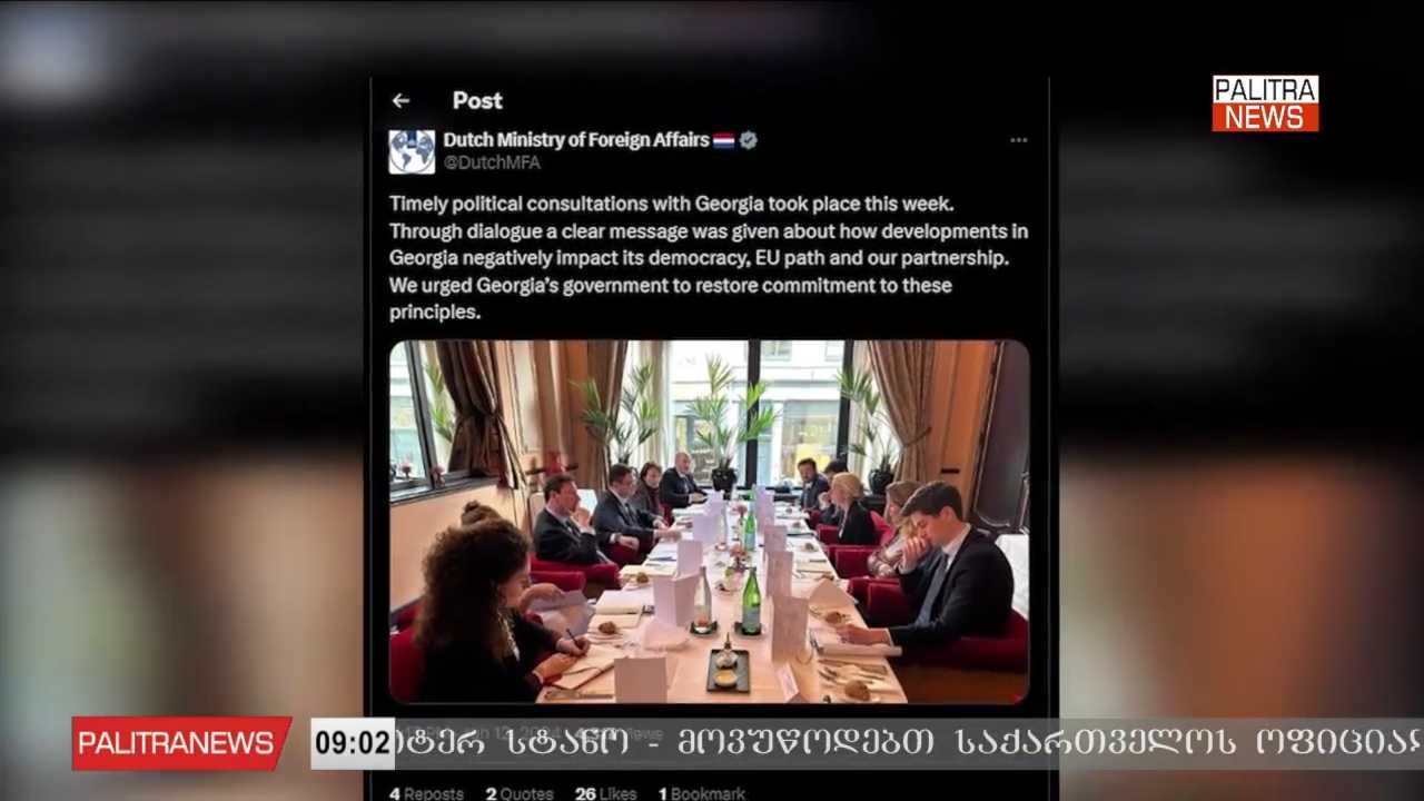 ნიდერლანდების საგარეო საქმეთა სამინისტრო საქართველოს მთავრობას მოუწოდებს პრინციპების ერთგულება აღადგინოს. უწყების მიერ სოციალურ ქსელში გამოქვეყნებულ განცხადებაში ნათქვამია, რომ საქართველოსთან პოლიტიკური კონსულტაციები გაიმართა. დიალოგის საშუალებით გაიცა მკაფიო გზავნილი იმის შესახებ, როგორ უარყოფითად აისახება საქართველოში განვითარებული მოვლენები ქვეყნის დემოკრატიაზე, ევროპის გზაზე და ნიდერლანდებთან პარტნიორობაზე.