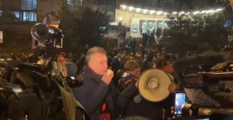 მოქალაქეები იმყოფებიან, როგორც უშუალოდ შენობასთან, ისე საავტომობილო გზის სავალ ნაწილზე, რის გამოც გადაკეტილია გზა.