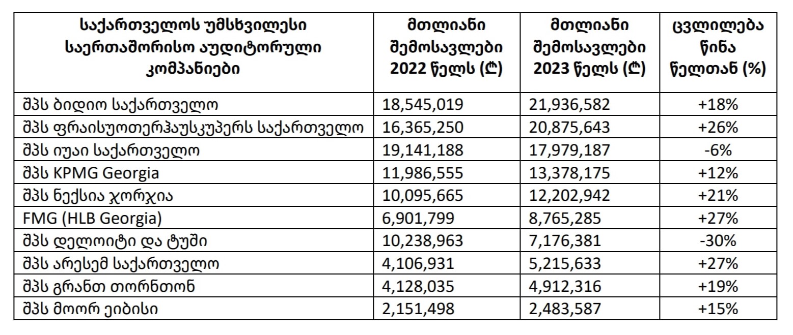 წლიური ანგარიშის მონაცემების საფუძველზე, აუდიტორული კომპანიების რეიტინგში კვლავ საერთაშორისო კომპანიები დომინირებენ. ლიდერის პოზიციაზე BDO საქართველოა, რომლის შემოსავალმაც 2023 წელს 21.9 მილიონი ლარი შეადგინა. მეორე ადგილზეა PWC საქართველო, 20.9 მილიონი ლარის წლიური შემოსავლით, მესამე პოზიციაზე EY საქართველო, რომლის ფინანსურმა მაჩვენებელმა 18 მილიონ ლარს მიაღწია. მეოთხე ადგილს KPMG Georgia იკავებს 13,378,175 ლარის შემოსავლით, მეხუთე ადგილზე კი Nexia Georgia, რომელმაც წლის განმავლობაში 12,202,942 ლარის შემოსავალი დააფიქსირა.