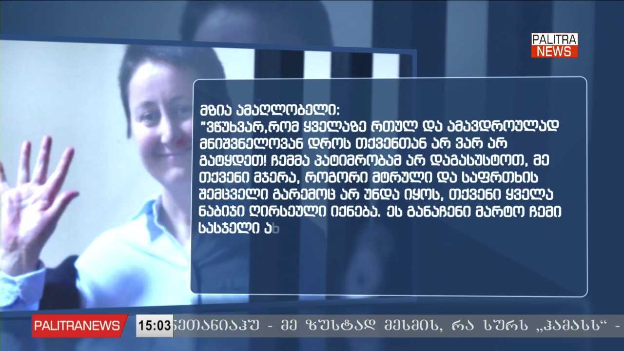 მოსამართლე, ნინო სახელაშვილი „ბათუმელებისა“ და „ნეტგაზეთის“ დამფუძნებლის, მზია ამაღლობელის სისხლის სამართლის საქმეზე გადაწყვეტილებას 6 აგვისტოს, 14:00 საათზე გამოაცხადებს. დღევანდელ სხდომაზე მზია ამაღლობელმა საბოლოო სიტყვით ისარგებლა - რაზე ისაუბრა დაპატიმრებულმა ჟურნალისტმა.