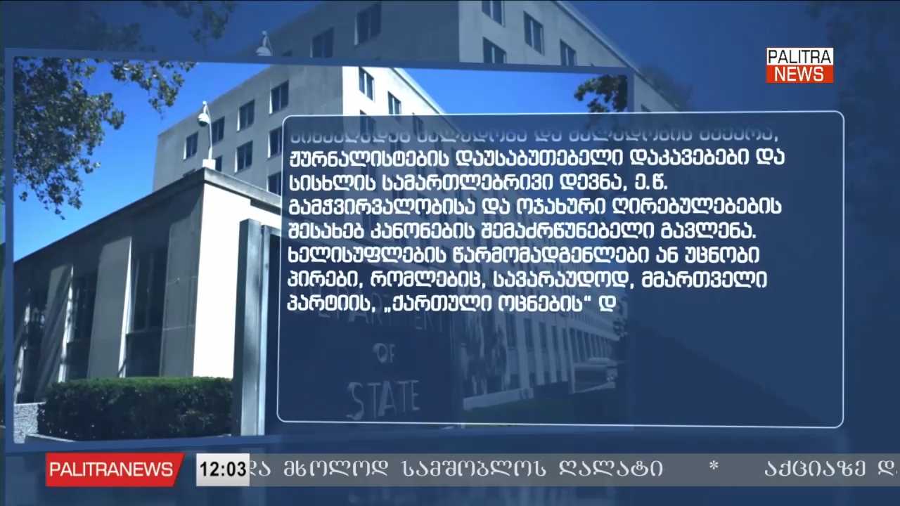 აშშ-ის სახელმწიფო დეპარტამენტმა საქართველოში ადამიანის უფლებების შესახებ ანგარიში გამოაქვეყნა. დოკუმენტში ნეგატიურ კონტექსტში არის ნახსენები ე.წ. „უცხოური გავლენის გამჭვირვალობის შესახებ“ და „ოჯახური ღირებულებებისა და არასრულწლოვანთა დაცვის შესახებ“ კანონები. აშშ-ის სახელმწიფო დეპარტამენტის წერს რომ საქართველოში მოქალაქეების, ჟურნალისტების და სხვა პირების მიმართ ფიზიკური თავდასხმების, დაშინებისა და ძალადობის მუქარის შესახებ ცნობები მთელი წლის განმავლობაში ვრცელდებოდა, თუმცა მთავრობის ოფიციალურ პირებს ძალადობასა და შევიწროებაზე პასუხისმგებლობა არ დაკისრებიათ. კიდევ რა წერია დოკუმენტში და როგორ აფასებენ, ანგარშის შინაარს საქართველოში?