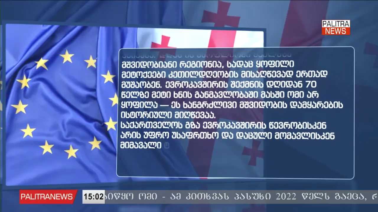 ევროპა მსოფლიოში ყველაზე მშვიდობიანი რეგიონია, სადაც ყოფილი მეტოქეები კეთილდღეობის მისაღწევად ერთად მუშაობენ - ამ განცხადებას საქართველოში ევროკავშირის წარმომადგენლობა ავრცელებს. მათი თქმით, საქართველოს გზა ევროკავშირის წევრობისკენ უფრო უსაფრთხო და დაცული მომავლისკენ მიმავალი გზაა. მანამდე, ალასკაში აშშ-ისა და რუსეთის პრზიდენტების შეხვედრის შემდეგ, მმართველი გუნდის წარმომადგენლებმა რუსეთ-უკრაინის ომთან დაკავშირებით უცვლელი შეფასებები გააკეთეს და დასძინეს, რომ ევროპულ ბიუროკრატიას ,,დიფ სთეითის’’ ხელით, საქართველოში მეორე ფრონტის გახსნა და რევოლუციური სცენარის მოწყობა სურდათ. იწურება იმ დათქმების შესრულების ვადაც, რომელიც ევროკომისიამ საქართველოს ხელისუფლებას ურთიერთობების ნორმალიზებისთვის განუსაზღვრა.