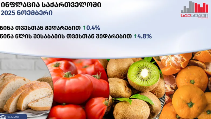 „საქსტატის“ მონაცემებით, 2025 წლის ნოემბერში, წინა თვესთან შედარებით, საქართველოში ინფლაციამ 0.4%, ხოლო წლიურმა ინფლაციამ 4.8% შეადგინა
