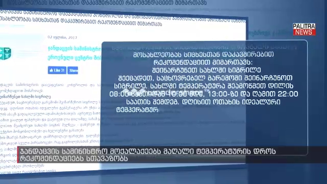 ჯანდაცვის სამინისტრო მოქალაქეებს მაღალი ტემპერატურის დროს რეკომენდაციებს სთავაზობს. ჯანდაცვის სამინისტრო მოქალაქეებს ურჩევს, შეინარჩუნონ სახლში სიგრილე, თავი აარიდონ სიცხეს, შეინარჩუნონ სხეული გრილად და ტენიანად, დაეხმარონ სხვებს. `palitranews.ge ჯანდაცვის სამინისტროს რეკომენდაციებს უცვლელად გთავაზობთ:„შეეცადეთ საცხოვრებელ გარემოში შეინარჩუნოთ სიგრილე. სახლში ტემპერატურა შეამოწმეთ დილის 08:00 საათიდან 10:00-მდე, 13:00-ზე და ღამით 22:00 საათის შემდეგ. დღისით ოთახის იდეალური ტემპერატურა არ უნდა აღემატებოდეს 32C, ხოლო ღამით კი - 24C-ს. ეს განსაკუთრებით მნიშვნელოვანია ბავშვებისა და 60 წლის ასაკს გადაცილებული ადამიანებისათვის, აგრეთვე მათთვის, ვისაც ქრონიკული დაავადებების დიაგნოზი აქვთ. ღამით გააღეთ ფანჯრები და დატოვეთ ღია დილამდე, სანამ გარეთ სიგრილე იქნება (თუ ეს სახიფათო არ არის). დღისით შეამცირეთ სახლში სიცხის შეღწევა - დახურეთ ფანჯრები, ჟალუზები და დარაბები, განსაკუთრებით მზის მხარეს. შეძლებისდაგვარად გამორთეთ ელექტრომოწყობილობები და ხელოვნური განათება. მზის მხარეს ჩამოაფარეთ დამჩრდილავი ფარდები, ჟალუზები, დარაბები. ჩამოკიდეთ სველი პირსახოცები, რაც გაგრილებასთან ერთად სახლს დაატენიანებს. თუ სახლში გაქვთ კონდენციონერი, დაკეტეთ კარებები და ფანჯრები, რათა ეფექტურად გამოიყენოთ ელექტროენერგია. ეს აგაცილებთ ქვეყანაში ელექტროენერგიის დეფიციტის საფრთხეს. ვენტილატორი გამოგადგებათ იმ შემთხვევაში თუ ტემპერატურა არ აღემატება 35C-ს. ხოლო თუ ტემპერატურა აღემატება 35C-ს, ის ვერ მოგიხსნით სიცხესთან დაკავშირებულ პრობლემებს. მიიღეთ დიდი რაოდენობით სითხე.გადადით ცხელი ოთახიდან გრილში, განსაკუთრებით ღამით. თუ შეუძლებელია სახლში სიგრილის შენარჩუნება, შეეცადეთ დღის 2-3 საათი გაატაროთ გრილ ადგილას (მაგალითად რომელიმე საზოგადოებრივ შენობაში, სადაც ჰაერი კონდენციონერით გრილდება). მოერიდეთ ქუჩაში გასვლას დღის ყველაზე ცხელ პერიოდში. მოერიდეთ მაღალინტენსიურ ფიზიკურ აქტივობას. თუ ეს აუცილებელია, მაშინ მის შეასრულებლად გამოიყენეთ დილით ყველაზე გრილი პერიოდი - 04:00-დან 07:00 საათამდე. არ დატოვოთ ბავშვები და შინაური ცხოველები გაჩერებულ სატრანსპორტო საუალებებში!მიიღეთ გრილი შხაპი, ან გამოიყენეთ ყინულის პაკეტები, სველი პირსახოცი, და სხვა.ქუჩაში გასვლისას ატარეთ ნატურალური მასალის, ღია ფერის, თავისუფალი ტანსაცმელი, ფართოფარფლებიანი ქუდი ან კეპი, ან ქოლგა, და მზისგან დამცავი სათვალე. იხმარეთ საწოლის მსუბუქი თეთრეული და არავითარი ბალიში, რათა სიცხის დაგროვება აი
