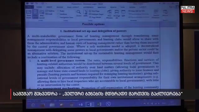 გაეროს სოფლის მეურნეობის და სურსათის ორგანიზაციის მიერ მხარდაჭერილი პროექტის "ველური ბუნების მდგრადი მართვის შესაძლებლობების გაძლიერება" ფარგლებში სამუშაო შეხვედრა გაიმართა. პროექტი მიზნად ისახავს საქართველოში ველური ბუნების რესურსების მართვის თანამედროვე სისტემის განვითარებას, ველური ბუნების რესურსების შესახებ არსებული ინფორმაციის გამჭვირვალობის გაუმჯობესებას, ასევე, დაგეგმვისა და ანგარიშგების მიზნებისთვის მათ გამოყენებას. სამუშაო შეხვედრაზე ექსპერტების მიერ განსახილველად წარმოდგენილი იყო პროექტის ფარგლებში შემუშავებული პირველი დოკუმენტის სამუშაო ვერსია, რომელიც მდგრადი ნადირობის რეგულირების საკითხებს ეხება.