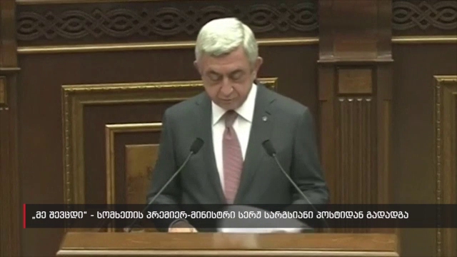 „შექმნილი სიტუაციიდან არსებობს რამდენიმე გამოსავალი. თუმცა, მე არც ერთ მათგანს არ ავირჩევ. ეს ჩემი არ არის. ვტოვებ პრემიერ-მინისტრის თანამდებობას. ქუჩის მოძრაობა ჩემი დანიშვნის წინააღმდეგია. მე ვასრულებ თქვენს მოთხოვნას: მშვიდობას და ჰარმონიას ვუსურვებ ჩვენს ქვეყანას", - ნათქვამია სერჟ სარგსიანის განცხადებაში.რადიკალური ოპოზიცია სომხეთში 13 აპრილიდან მასობრივ აქციებს იმის გამო ატარებს, რომ ქვეყნის პრემიერ-მინისტრის თანამდებობაზე ყოფილი პრეზიდენტის სერჟ სარგსიანის კანდიდატურა წარადგინეს. აქციების მიუხედავად, 17 აპრილს სომხეთის პარლამენტმა სარგსიანი პრემიერ-მინისტრად აირჩია, აქციის ორგანიზატორმა ნიკოლ ფაშინიანმა კი განაცხადა, რომ „ხავერდოვან რევოლუციას“ იწყებს.