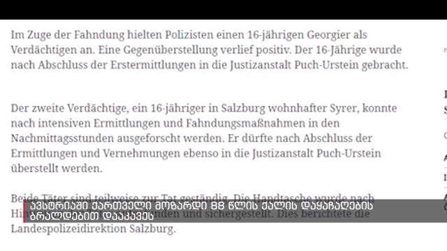 ავსტრიის ქალაქ ზალცბურგში საქართველოს მოქალაქე 88 წლის ქალის დაყაჩაღების ბრალდებით დააკავეს. ავსტრიული მედიის ინფორმაციით, საქართველოს 16 წლის მოქალაქე თავს დაესხა 88 წლის ქალს, ხელიდან ჩანთა და საფულე გასტაცა და მიიმალა. ძებნის შედეგად პოლიციამ ქართველი მოზარდი და მისი სირიელი თანამზრახველი დააკავა. დაზარალებულმა ქალმა ორივე ეჭვმიტანილი ამოიცნო. ბრალდებულები პუხ-ურშტაინის ციხეში არიან გადაყვანილები.