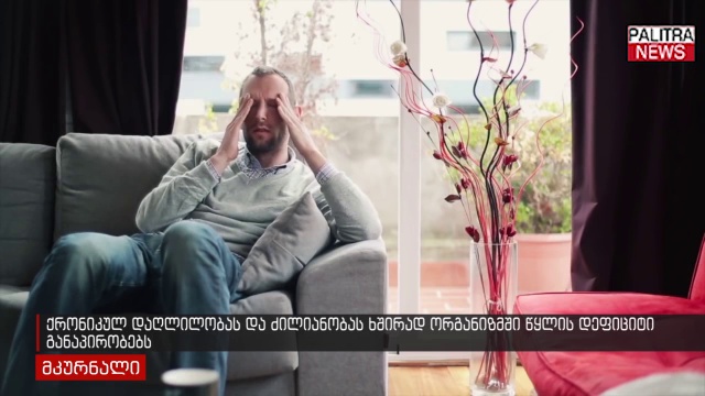 გაითვალისწინეთ, შეუძლოდ ყოფნის მიზეზი, ისევე, როგორც ორგანიზმში აღმოცენებული ბევრი პათოლოგიისა, წყლის დეფიციტია! ნუ დაელოდებით ამის მანიშნებელ წყურვილის შეგრძნებას, დღის განმავლობაში აუცილებლად სვით წყალი, თუნდაც ყლუპ-ყლუპად, ყოველ 2 საათში! გახსოვდეთ წყალი უმნიშვნელოვანესია ჯანმრთელობისათვის!ქრონიკულ დაღლილობას და ძილიანობას ხშირად ორგანიზმში წყლის დეფიციტი განაპირობებს. როდესაც ორგანიზმს წყალი აკლია, ის მისი მოძიების ქცევას რთავს, თუ გარედან ვერ იღებს, შიდა რეზერვების მოძიება-მობილიზებას იწყებს, მათ შორის, სისხლიდან ახდენს გადანაწილებას, რაც სისხლის რამდენადმე გასქელებას და ცირკულაციის დარღვევას განაპირობებს, შედეგად ჟანგბადის ნაკლებობა ვითარდება. სწორედ ამ პროცესით არის გამოწვეული ძილიანობა. ასე რომ ნუ გაგიკვირდებათ, თუ თქვენ სულ გეძინებათ და გამოძინების მიუხედავად, მაინც ვერ იკრებთ ძალებს, მუდმივად გაწუხებთ დაღლილობა, ყავაც ვეღარ გაფხიზლებთ, წყლის სმის რეჟიმს დაუთმეთ მეტი ყურადღება. რეგულარულად სვით წყალი და თქვენი მდგომარეობა შეიცვლება!