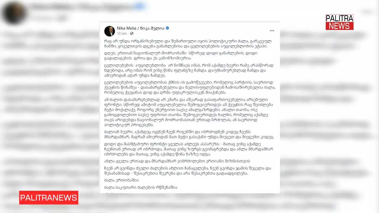 "ნაციონალური მოძრაობის“ თავმჯდომარის ნიკა მელიას განცხადებით, პარტიაში დიდი განახლების, დიდი გადალაგების დროა, რაც კანონზომიერია.