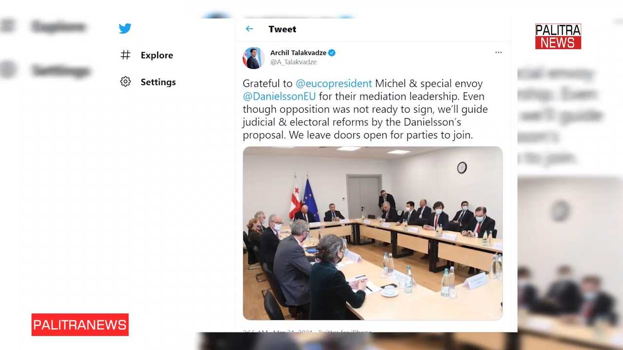 „მადლიერი ვართ ევროპული საბჭოს პრეზიდენტის, შარლ მიშელისა და სპეციალური წარმომადგენლის კრისტიან დანიელსონის მიერ მედიატორობის ხელმძღვანელობისთვის. მიუხედავად იმისა, რომ ოპოზიცია არ იყო ხელმოწერისთვის მზად, ჩვენ დანიელსონის შემოთავაზების მიხედვით განვახორციელებთ სასამართლო და საარჩევნო რეფორმას. ჩვენ ღიას ვტოვებთ კარს პარტიებისთვის, რომ შემოგვიერთდნენ“, – წერს არჩილ თალაკვაძე.