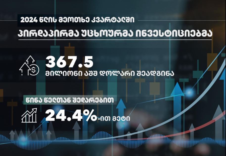 2024 წლის მეოთხე კვარტალში პირდაპირმა უცხოურმა ინვესტიციებმა 367.5 მლნ. აშშ დოლარი შეადგინა, რაც წინა წლის მეოთხე კვარტლის მონაცემს 24.4%-ით აღემატება.
