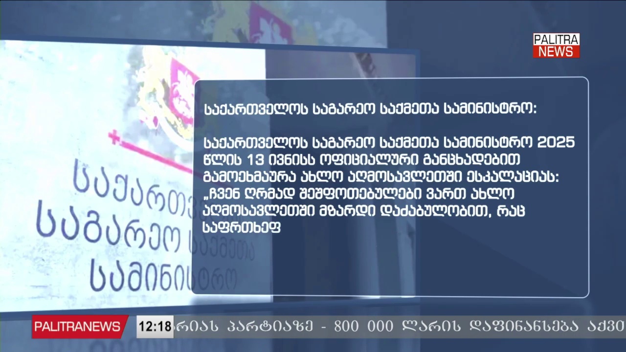 საქართველოს საგარეო საქმეთა მინისტრის მოადგილის სამძიმარი ირანის ხელისუფლებას და შეშფოთებული საერთაშორისო პარტნიორები - საქართველოს საგარეო საქმეთა მინისტრის მოადგილე, ალექსანდრე ხვთისიაშვილი თბილისში ირანის საელჩოში, სახელწოდებით „ისრაელის რეჟიმის განხორციელებული თავდასხმისას დაღუპულ მოწამეთა ხსოვნისადმი“ მიძღვნილ ღონისძიებაზე მივიდა და ირანს სოლიდარობა გამოუცხადა. აღნიშნულ საკითხთან დაკავშირებით ოფიციალური განცხადებით საქართველოს ხელისუფლება მწვავედ გააკრიტიკა ისრაელის საელჩომ. ხელისუფლების ოპონენტები და საერთაშორისო პარტნიორები “ქართული ოცნების“ გადაწყვეტილების მიმართ უკმაყოფილებას არ მალავენ - რა განცხადებები გავრცელდა ისრაელისა და ირანის საელჩოების მხრიდან და როგორ ეხმაურებიან მიმდინარე მოვლენებს დასავლელი პარტნიორები?
