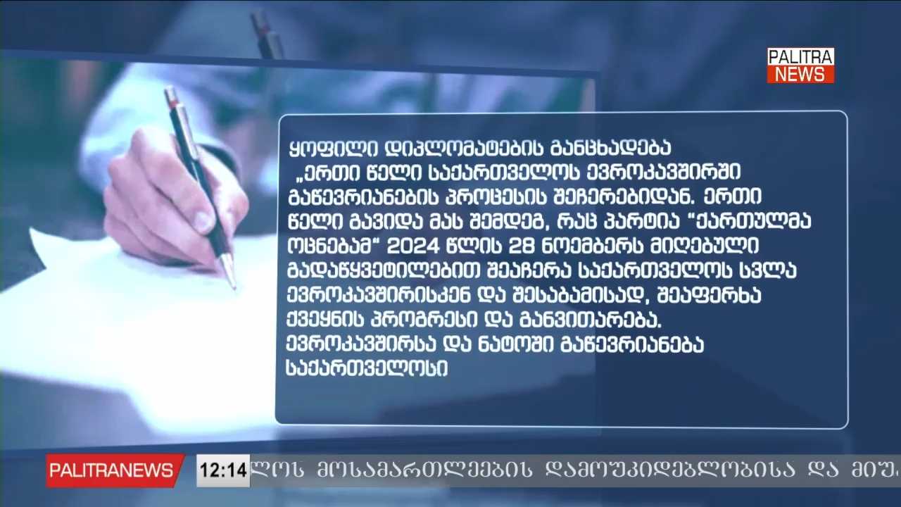 საპროტესტო აქციები, არაერთი კრიტიკული ანგარიში თუ რეზოლუცია, საბოლოოდ კი, დასავლეთთან ურთიერთობის გაუარესება - ასეთია გასული 1 წლის მოვლენათა ქრონოლოგიის მცირე შეჯამება. 118 ქართველი დიპლომატი ერთობლივი განცხადებით, პარტნიორებს მიმართავენ, გაითვალისწინონ მოქალაქეების უმრავლესობის ნება და საქართველოს ევროპული პერსპექტივის მხარდაჭერა გააგრძელონ. მმართველი გუნდის წარმომადგენლები კი აცხადებენ, რომ საქართველოს საგარეო კურსი და ორიენტაცია მკაფიოა და ის კონსტიტუციაშია ასახული. ქართული მხარე ევროინტეგრაციის პროცესის შეჩერებაში პასუხისმგებლობას ევროკავშირს აკისრებს. როგორც აღნიშნავენ, ევროკავშირის ელჩის წერილი ადასტურებს, რომ გაწევრიანების პროცესი ევროპას 5-6 თვით ადრე ჰქონდა შეჩერებული. თავის მხრივ, ოპოზიცია, "ქართული ოცნების" პოლიტიკას აკრიტიკებს, ამბობენ რომ ანტიდასავლური რიტორიკის ფონზე, ქვეყნის დასავლური ინტეგრაცია შეუძლებელია. ვიდრე, მხარეები ურთიერთბრალდების რეჟიმში არიან, კრიტიკული გზავნილები ისმის ევროპელი დიპლომატებისგან. ამჯერად, საქართველოში გერმანიის ელჩმა, პიტერ ფიშერმა გნამარტა, რომ ქვეყნის დასავლური ინტეგრაცია დაპაუზებულია, რაზეც საბოლოო შეფასებას, დეკემბერში, ევროპული საბჭო გააკეთებს.