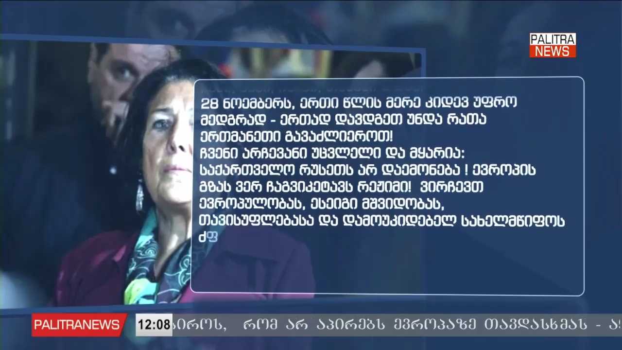 მივიღეთ გადაწყვეტილება, 2028 წლის ბოლომდე დღის წესრიგში არ დავაყენოთ ევროკავშირთან მოლაპარაკებების გახსნის საკითხი - ეს სიტყვები საზოგადეობამ 2024 წლის 28 ნოემბერს "ქართული ოცნების" ოფისში გამართული ბრიფინგიდან მოისმინა. მმართველი გუნდის გადაწყვეტილებას საპროტესტო აქციები მოჰყვა, 1 წლის შემდეგ, სიმბოლურად, ამავე თარიღზე, დემონსტრანტები მასშტაბურ საპროტესტო აქციას გეგმავენ. დღეს, 19:00 საათზე თბილისის სახელმწიფო უნივერსიტეტის პირველ კორპუსთან მოქალაქეები შეიკრიბებიან და მსვლელობით რუსთაველის გამზირზე გადაინაცვლებენ. აქტივისტების თქმით, სიმბოლური თარიღი ერთობის სადემონსტრაციოდ დამატებითი შესაძლებლობაა, რომელიც სხვა გზავნილებთან ერთად, აჩვენებს, რომ ქართული საზოგადოება ქვეყნის ევროპული პერსპექტივის დაკარგვას არ შეეგუება. დაგეგმილ აქცია-მსვლელობას უერთდებიან, როგორც პარლამენტის წინ მოშიმშილეები, ისე ოპოზიციური პოლიტიკური ჯგუფები და სხვადასხვა სფეროს წარმომადგენლები. დემონსტრანტთა რიგებში არ იქნებიან "გახარია საქართველოსთვის" წევრები. პარტიაში ამბობენ, რომ "ნაციონალური მოძრაობის" გვერდით არ დადგებიან. როგორია აქციის დღის წესრიგი.