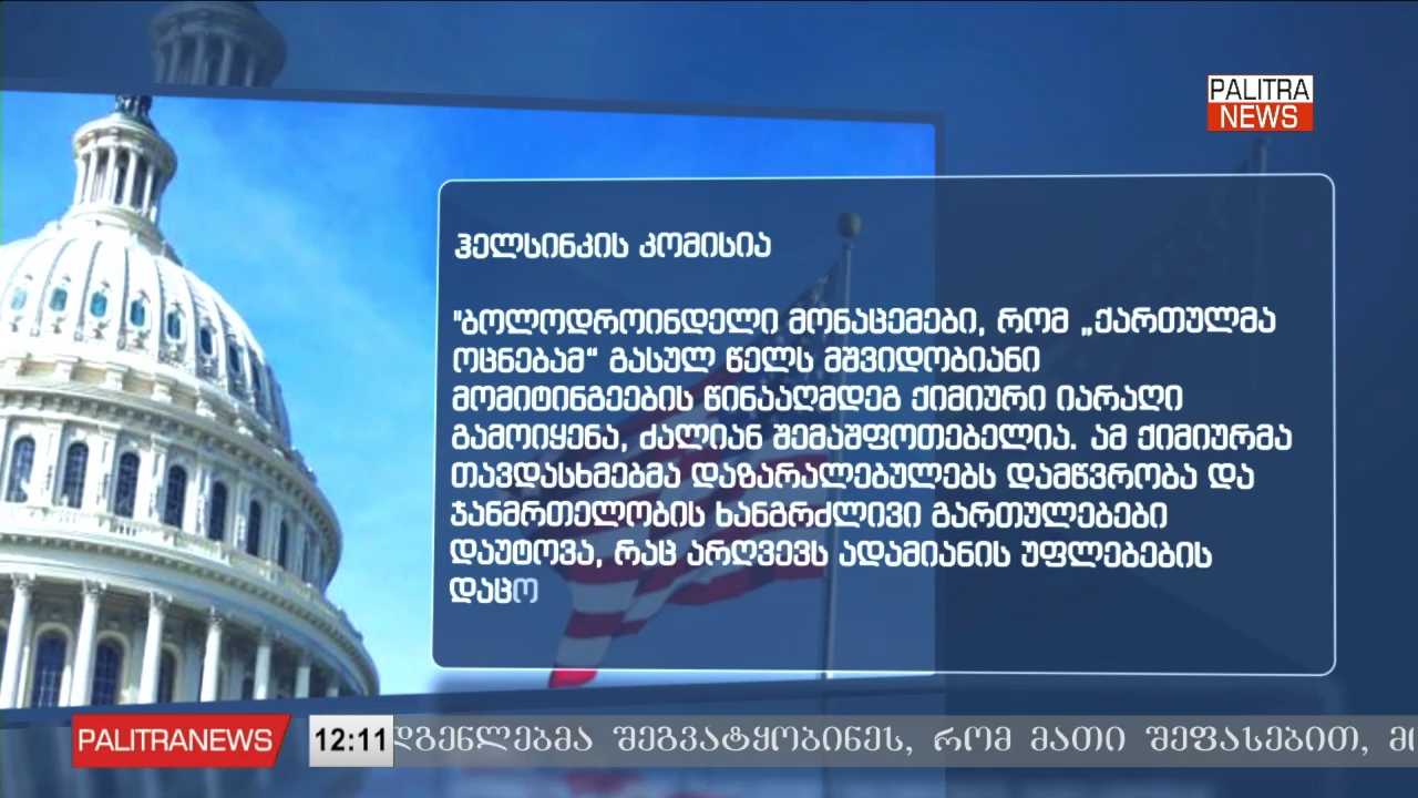 1. „ბოლოდროინდელი მონაცემები, რომ „ქართულმა ოცნებამ“ გასულ წელს მშვიდობიანი მომიტინგეების წინააღმდეგ ქიმიური იარაღი გამოიყენა, ძალიან შემაშფოთებელია, - ამის შესახებ აღნიშნულია განცხადებაში, რომელსაც აშშ-ის ჰელსინკის კომისიის თავმჯდომარე, სენატორი როჯერ უიკერი, თანათავმჯდომარე ჯო უილსონი და წევრები : სენატორი შელდონ უაით ჰაუსი და სტივ კოენი ავრცელებენ. განცხადებაში კონგრესმენები ახსენებენ, მათივე სიტყვებით ქიმიური თავდასხმების შედეგად დაზარალებულების ჯანმრთელობის ხანგრძლივ გართულებებს და აშშ-ის მთავრობას მოუწოდებენ, გადაამოწმონ ცნობები, პასუხისმგებელ პირებს კი სანქციები დაუწესონ. თემაზე მაგდა ბლუაშვილი მუშაობს. მას პარლამენტიდან ვრთავთ.