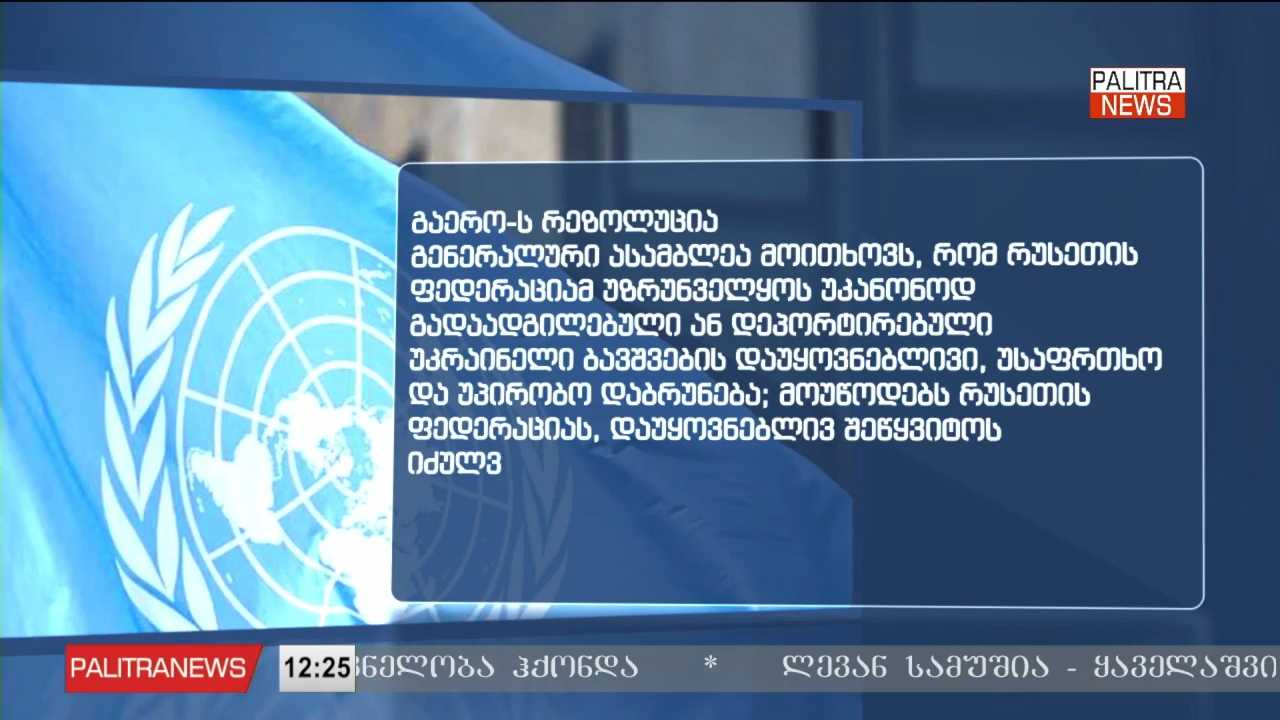 გაერო-ს გენერალურმა ასამბლეამ სპეციალურ საგანგებო სესიაზე მიიღო რეზოლუცია, რომელიც რუსეთისგან მოითხოვს, დააბრუნონ გატაცებული უკრაინელი ბავშვები. რეზოლუციას 91-მა ქვეყანამ დაუჭირა მხარი, მათ შორის, საქართველომ. რეზოლუციის მხარდამჭერებს შორის არიან აშშ, კანადა, გერმანია, საფრანგეთი, შვედეთი, უნგრეთი, ლატვია, ლიეტუვა, პოლონეთი. რეზოლუციის მხარდამჭერი ქვეყნები მოსკოვისგან ითხოვენ, უზრუნველყოს ყველა უკრაინელი ბავშვის დაუყოვნებლივი, უსაფრთხო და უპირობო დაბრუნება, რომლებიც იძულებით გადაიყვანეს ან დეპორტირებულები არიან. გაერო-ს გენერალურმა ასამბლეამ რეზოლუცია მას შემდეგ მიიღო, რაც აშშ-ის პრეზიდენტის, დონალდ ტრამპის სპეციალური წარმომადგენელი, სტივ უიტკოფი და მისი სიძე, ჯარედ კუშნერი კრემლში რუსეთის პრეზიდენტს, ვლადიმერ პუტინს შეხვდნენ.