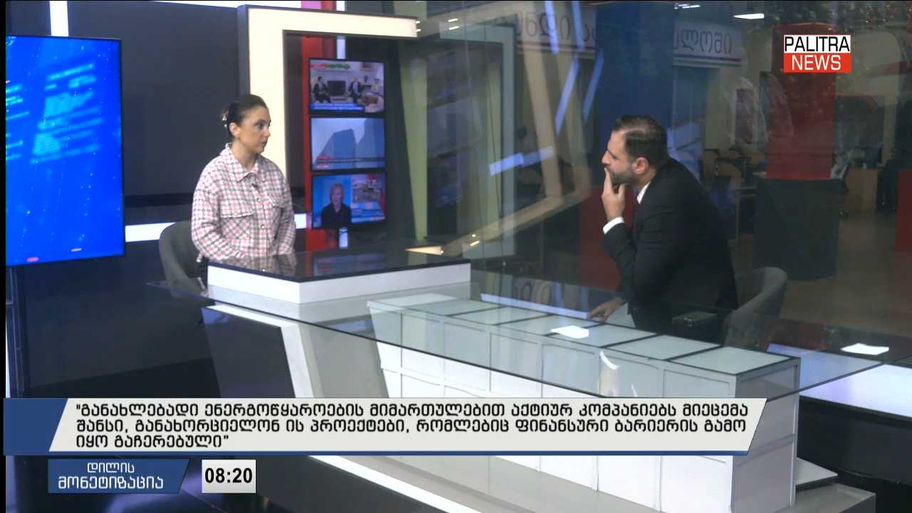 "განახლებადი ენერგოწყაროების მიმართულებით აქტიურ კომპანიებს მიეცემა შანსი, განახორციელონ ის პროექტები, რომლებიც ფინანსური ბარიერის გამო იყო გაჩერებული” - "დილის მონეტიზაციის" სტუმარია GREDA-ს აღმასრულებელი დირექტორი მაია მელიქიძე.