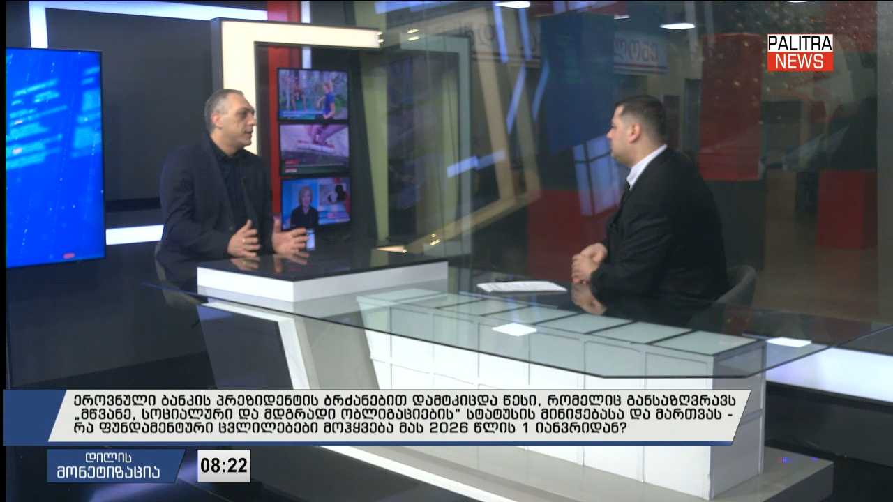 ეროვნული ბანკის პრეზიდენტის ბრძანებით დამტკიცდა წესი, რომელიც განსაზღვრავს „მწვანე, სოციალური და მდგრადი ობლიგაციების“ სტატუსის მინიჭებასა და მართვას - რა ფუნდამენტური ცვლილებები მოჰყვება მას 2026 წლის 1 იანვრიდან? - "დილის მონეტიზაციის" სტუმარია GREDA-ს იურისტი ლევან კოკაია