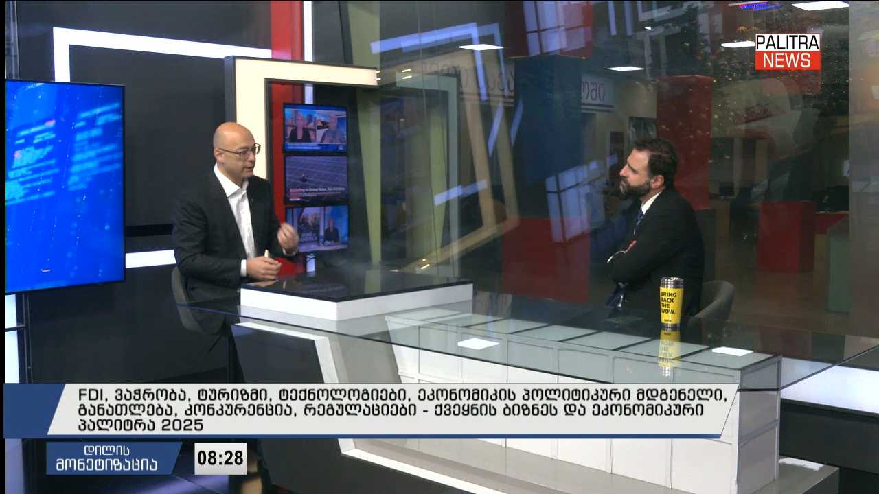 FDI, ვაჭრობა, ტურიზმი, ტექნოლოგიები, ეკონომიკის პოლიტიკური მდგენელი, განათლება, კონკურენცია, რეგულაციები - ქვეყნის ბიზნეს და ეკონომიკური პალიტრა 2025 - "დილის მონეტიზაციის" სტუმარია საქართველოს ეკონომიკისა და მდგრადი განვითარების მინისტრი 2018-2019 წლებში გიორგი ქობულია.