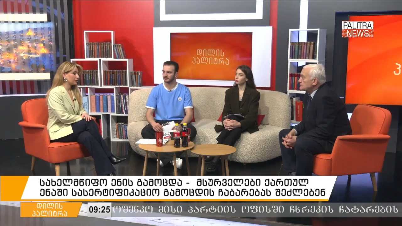 სახელმწიფო ენის გამოცდა - მსურველები ქართულ ენაში სასერტიფიკაციო გამოცდის ჩაბარებას შეძლებენ - "დილის პალიტრის" სტუმარია სახელმწიფო ენის დეპარტამენტის თავმჯდომარე გიორგი ალიბეგაშვილი.