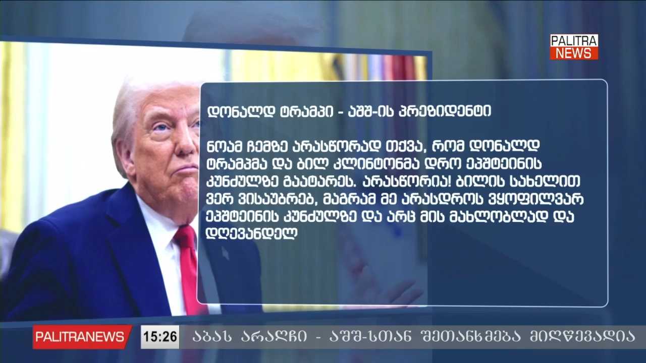 არასდროს ვყოფილვარ ეპშტეინის კუნძულზე და არც მის მახლობლად – ამის შესახებ აშშ-ის პრეზიდენტი დონალდ ტრამპი სოციალურ ქსელში წერს. აშშ-ის პრეზიდენტი გამოეხმაურა ამერიკელი ტელეწამყვანისა და კომიკოსის, ტრევორ ნოას მიერ „გრემის“ დაჯიდლოებაზე გაკეთებულ განცხადებას, რომლის მიხედვითაც, დონალდ ტრამპმა და ბილ კლინტონმა ეპშტეინის კუნძულზე დრო გაატარეს. თეთრი სახლის ლიდერი ასევე აცხადებს, რომ აპირებს, ტრევორ ნოას ცილისწამებისთვის უჩივლოს. ამერიკის პრეზიდენტის განმარტებით, ამის შემდეგ მას საკმაოდ დიდი თანხის გადახდა მოუწევს.