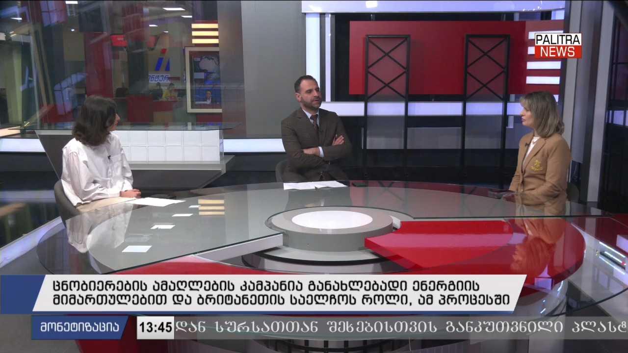 ცნობიერების ამაღლების კამპანია განახლებადი ენერგიის მიმართულებით და ბრიტანეთის საელჩოს როლი, ამ პროცესში - "დილის მონეტიზაციის" სტუმრები არიან დიდი ბრიტანეთის საელჩოს პროგრამისა და პოლიტიკის მიმართულების ოფიცერი ნინო ჩიქვანაია და GREDA-ს სტრატეგიული განვითარებისა და კომუნიკაციების ხელმძღვანელი ირინა ქომეთიანი.