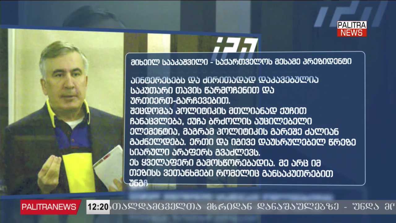 "ოპოზიციური ალიანსი" და მიხეილ სააკაშვილი კვლავ ერთმანეთს უპირისპირდებიან. ექსპრეზიდენტი ოპოზიციურ ალიანს სამოქმედო გეგმას უწუნებს და აცხადებს, რომ შეცდომაა პოლიტიკის მთლიანად ქუჩით ჩანაცვლება, სააკაშვილი წერს, რომ ქუჩა ბრძოლის აუცილებელი ელემენტია, მაგრამ პოლიტიკის გარეშე ძალიან გაძნელდება. მისი თქმით, ოპოზიციამ უნდა შეწყვიტოს წინასწარ გაკვალული ტრაექტორიით ერთი და იგივე წრეზე სიარული. "ოპოზიციურმა ალიანსმა" სააკაშვილის კრიტიკა პერსონალურ თავდასხმად შეაფასა. შესაძლოა "ალიანსი" "ნაციონალურმა მოძრაობამ" დატოვოს, რადგან პარტიაში აცხადებენ, რომ ვერასდროს იქნებიანი ისეთი გაერთიანების ნაწილი, რომელიც ანტიმიშას პოზიციებს ითავსებს.