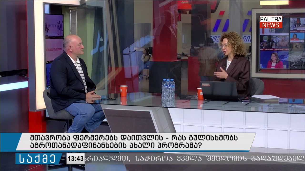 მთავრობა ფერმერებს დაითვლის - რას გულისხმობს აგროთანადაფინანსების ახალი პროგრამა? - გადაცემა "საქმის" სტუმარია „ხილ-ბოსტნეულის ექსპორტიორთა ასოციაციის“ თავმჯდომარე ვახტანგ ბეჟიტაშვილი.