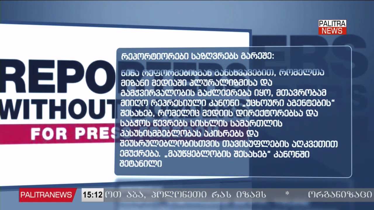ორგანიზაციის „რეპორტიორები საზღვრებს გარეშე“ მედიის თავისუფლების 2026 წლის ინდექსის თანახმად, ბოლო ერთ წელში საქართველომ რეიტინგში 21 ადგილით უკან დაიხია და მსოფლიოში 135-ე ადგილს იკავებს. ანგარიშში აღნიშნულია, რომ სახელმწიფოს მიერ ჩარევა მედიის თავისუფლების გაუმჯობესებისკენ მიმართულ ძალისხმევას ძირს უთხრის.